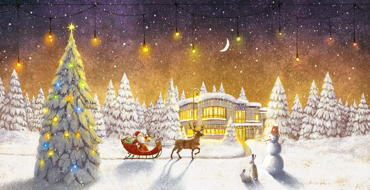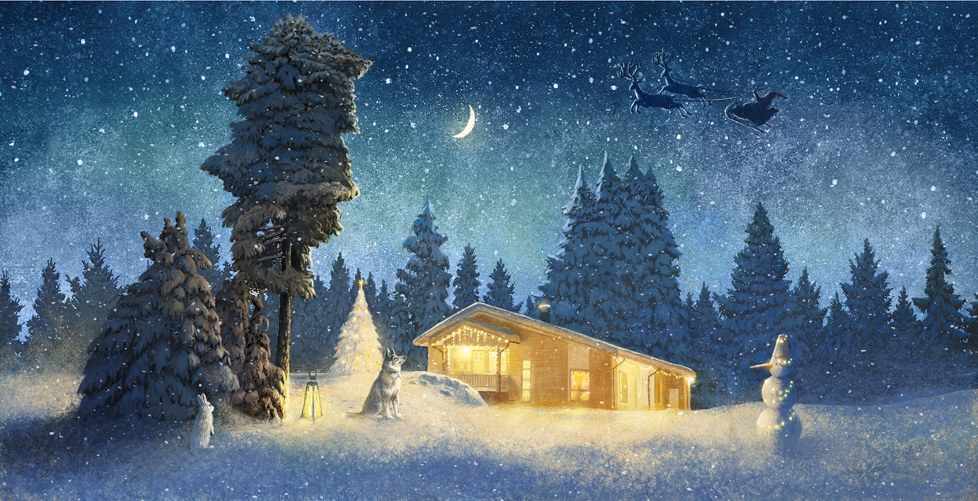 А на иллюстрации для сотрудников — здание офиса компании, к которому подъезжает Дед мороз с подарками. И пару зайчиков, которые его встречают. Куда же без животных в Карелии :)