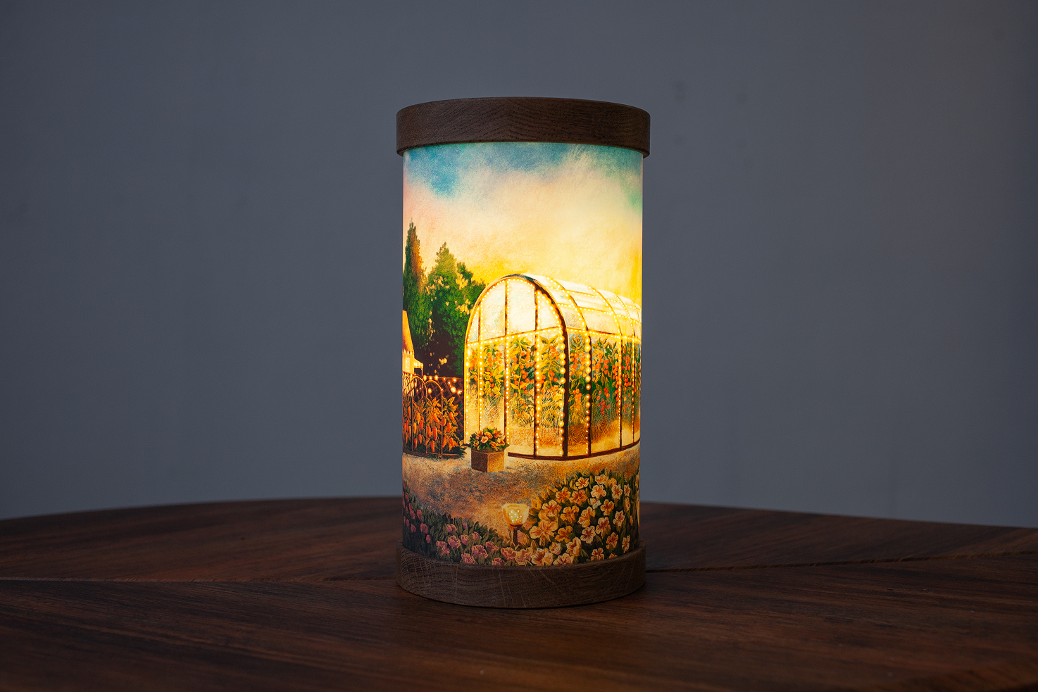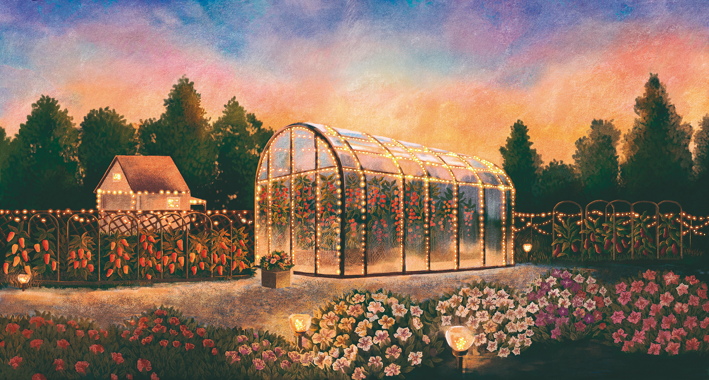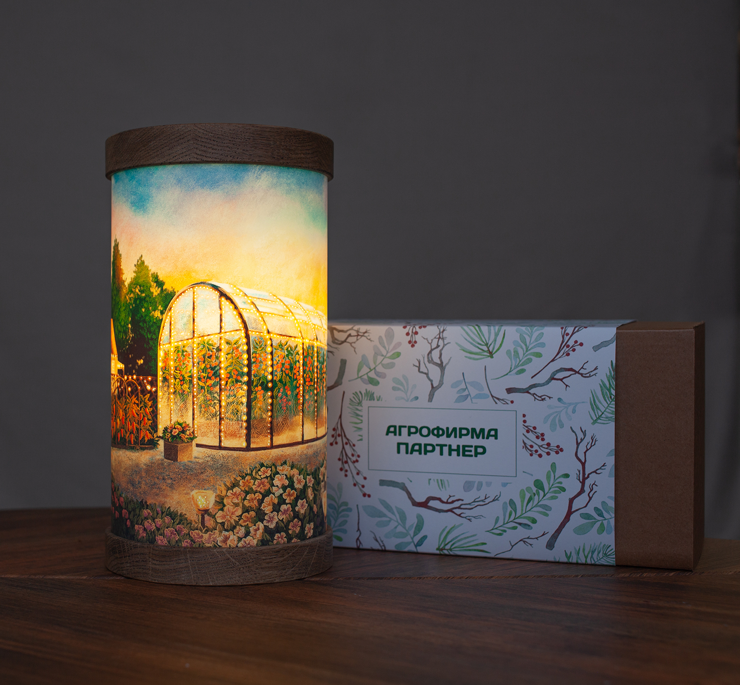 На иллюстрации решили изобразить демонстрационную площадку агрофирмы. Важно было точно передать конкретные теплицы, цветы и овощные культуры, но при этом сделать иллюстрацию теплой и уютной, чтобы светильник было приятно поставить у себя дома получателям подарков.